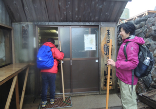 5:08 九合目の石室 寒さと雨が厳しく、九合目の石室に逃げ込みました。 日の出まであとちょっと。(5時35分) |