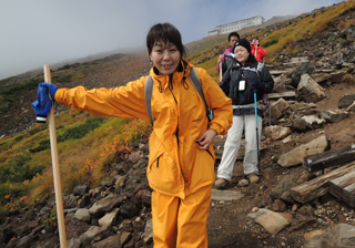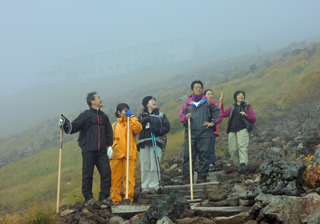 | 6:07 山頂を目指して ちょっと小ぶりになりました。 チョコレートなど甘いものをたっぷりいただき、ほっと一息。でも体は冷える一方なので、山頂目指して出発! 実は、山頂は目の前に見えています。しかし霧雨のため、視界はおよそ10m。 |
