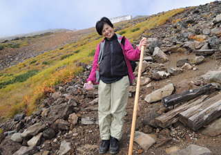 | 下山開始と言っても、このすぐ下の剣ヶ峰山荘で、金剛杖に焼印をしていただきます。 10:06 御嶽剣ヶ峰山荘 木曽ヒノキの金剛杖にバーナーで温めた焼きゴテをあてると、ジュッ音がして、ジジジと焦げながら、いい香りがしてきます。(動画) 気温は4℃。『山の天気予報』で知ってましたが、まさか、ほんまに4℃になるとは!温かいお茶がありがたいです。 |