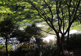 | 7時25分、猩々池に到着〜。 空と、木々の緑と、池。気持ちええ〜。 |