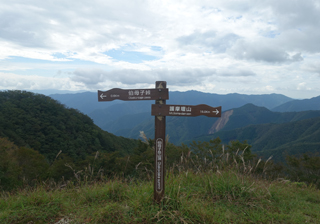 | こっから護摩壇山へ行けるんや。 伯母子峠、伯母子岳、護摩壇山へ分かれる分岐点で、小辺路は伯母子峠がルートやけど、ぼくは山頂の伯母子岳を目指す! |
