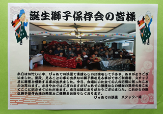 | 獅子舞3頭が入り口から飛び込んでいって、元気よく頭(かしら)を振って、3頭が並びました。するとあちこちから歓声があがり、目をキラキラさせて観てくださりました。 「さぁ、これから皆さんを噛んで参りますよ〜!」 ぼくと皆さんの掛け合いトークが爆笑となって、たくさんの笑顔があふれるなか、獅子舞がお一人づつ噛んでいき、最後に集合写真を撮りました。いい日和でした! |