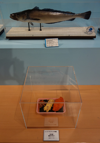 | 深海魚は、案外身近なところで食材となっている。 例えば、のり弁の白身フライは、ニュージーランドベイク。 フィッシュバーガーの白身フライは、ホキ。 フィッシュ&チップスの白身フライは、オヒョウ。 みな、深海魚やねんて。 出口のショップで、6m実物大のダイオウイカ人形があった。客寄せ用か?買う人おんの?これは要らんやろう。でかすぎ!(笑) |