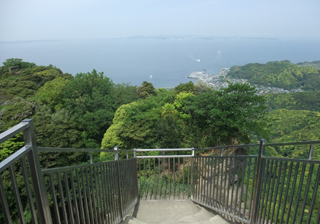 目指す『地獄のぞき』が眼下に見えた。 あら、こっからあそこと日本寺に行くには、また石切り場まで戻らなアカンのね。 あらら、さっきの道は手すりを持って、体を引き上げるほど急やったからなぁ、結構下るなぁ。ま、しゃーない。 |