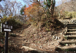 | 10:05 弁慶茶屋跡 分岐点があった。下からあがってきた人の多くが、すでに息があがっているようや。でも、まだ上がりはんのやろ?ここから山頂まで、もっときついで。足場は、岩がごろごろしてるし急坂。 そんな片手にコンビニ袋をぶらさげた、「ちょっと散歩に」程度の足元で大丈夫か?せめて靴だけは、パンプスとか革靴はやめたほうがええで。 |