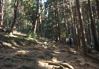 ちょっとした杉林から、すぐに九十九折りの登山道になっていった。 いや〜前にも後ろにも人が途切れない。それにもう降りてくる人がいた。 早いなぁ。ぼくもできれば、それぐらい早くに登りたいんやけど、なにしろ朝一番の電車に乗ってもこれやからなぁ。都心はあかん。 |