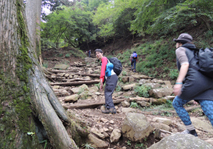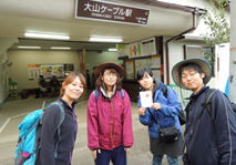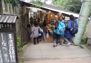 9:10 大山ケーブルカーバス停。 ケーブルカーの駅までちょっと歩きます。お土産屋さん、お食事処や宿屋が並ぶ、こま参道です。 ケーブルカーには乗らず、ケーブルカー横のハイキングコース=女坂を歩いていきます。だって関東ハイキング連盟だもん! |