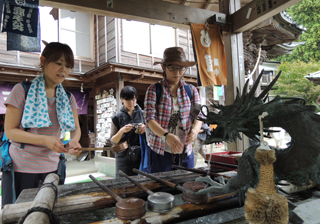 | 二重の滝を通り過ぎて、再び、阿夫利神社に到着! 14:45、阿夫利神社 「あ〜、疲れたー!」 人が多いんで、細い登山道では抜かしてもらうのが難しく、道の譲りあいで閉口しました。ふと山頂を見上げると、黒雲に覆われていて、形が見えなくなっていました。 |