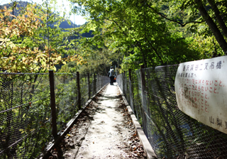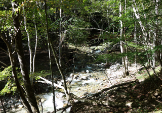 | 15:20 折り返し 折り返しポイント。ここからは、昔(と言っても、昭和40年代まで現役)、切り出した木材を運ぶために使ってたトロッコ軌道を辿って帰ります。 行きの渓流沿いとは違う平坦な道で、展望台があったり、眼下にさっきの渓流が見えたりして、行きと帰りで、ぜんぜん違う表情のコース。西沢渓谷は楽しませてくれるわ〜。 沢の音が遠くで聞こえる。 |