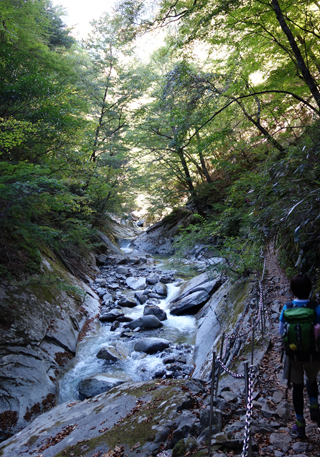 大久保の滝が見えました。 西沢渓谷には滝がたくさんあります。長く高低差のあるものや、段々になっているものなど、一つ一つタイプが違うんで滝好きにはたまらんやろう。 水量も多いし、岩肌が綺麗で、ちょうどええ感じに木々が重なり、角度を変えると同じ滝でもぜんぜん違う表情に見えました。 ちょっと歩くとダイナミックに景色が変わっていくので歩いてて楽しいです。 三重の滝、魚止滝が見えてきました。 キャニオニングしたら楽しいやろうなぁ。岩の間をすごい勢いで水が流れていました。 滝を見やすいように展望台があり、ほんま親切なコースです。 |