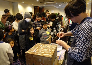 午前の部がオープンしました。 ミニ縁日コーナーはどこも人気で、ちびっ子たちは一つ遊ぶごとにもらえるシール集めに夢中です。 「あれ、やった?」 「まだ?」 「こっちだよ」 と全制覇した子が教えてたりしています。 |