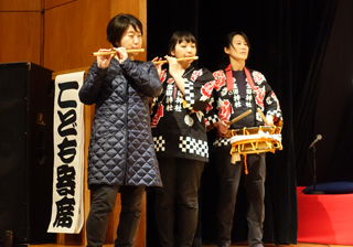 | ワキの一人、男の子は今日からの2日間、午前と午後の4公演のすべてに出ます。 もう一人、女の子はこれが初舞台です。初舞台とは思えない笑顔と舞いっぷりです。 さぁ、二人とも頑張れ! |