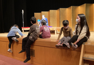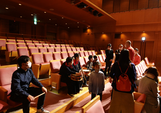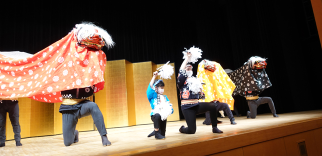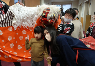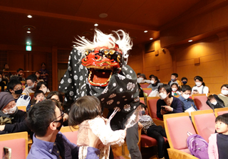 ぼくらは前座で本公演は落語、漫才、紙切りと続きます。その間にランチ。 戻ってきて本番終了後にロビーで獅子舞でお見送りをします。さっき噛まれなかった子たちを噛みます。 |