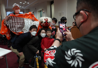 | 立ち位置と動線を確認して、着替えです。 開場し、ロビーの各所でお正月遊びができるコーナーがあり、どこも大賑わいです。 ・かるた ・投扇興 ・小座布団積み プリント用紙が配られて「まちがいさがし」、「スタッフとじゃんけん」などでシールを集めていきます。 そして五十嵐さんの飴細工。 ぼくらは「獅子舞と一緒に写真を撮ろう!」コーナーを担当です。 |