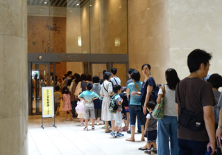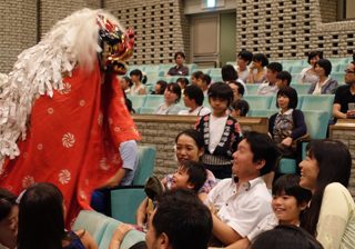 | でーもー、まだ続きますよ! 舞台での『誕生獅子』を演舞して、一礼。 すぐに「どうちゅうーーーー!」の掛け声で、観客席へ獅子3頭が流れ込んでいきます。 皆さんの頭を噛んでまわります。 ここ埼玉では、キャーと怖がったり、「この世のおしまい」のような形相で泣き叫ぶ子より、ニコニコ笑顔で頭を出してくる子のほうが多かったです。 |