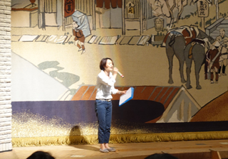 | 緞帳の後ろ、舞台上に3人の脇が座っています。 緞帳があがっていくと、3人の「よーーー!」の掛け声でお囃子がスタートです。 |