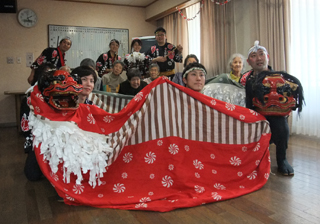 | 13:30、午後のレクリエーションの時間がスタート。 まず紹介を受けて、ぼくが簡単に獅子舞の紹介をします。そして、すぐに誕生獅子を演舞。 子獅子が生まれた瞬間に、一番驚いてたのが、目の前で写真を撮りまくってた職員さんです。 「うわー!!!」 と、声に出して驚かれてました。 ふふふ、してやったりです。 |