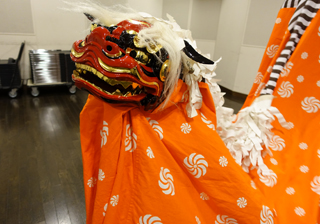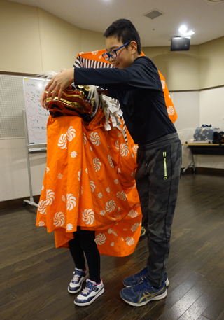 たまに休憩をはさみながら、次のステップとして、子供たちに獅子の持ち方から教える。 |
