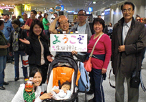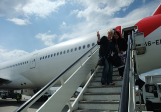 | この狭い狭いエコノミーの座席で何十時間も過ごしてると、今回の旅は移動が目的か?と思うようになってきました。 さぁ、フランクフルトに到着しました! 快晴です。気温は20℃。Tシャツ1枚でオッケーです。思いっきり背伸びをしました。気持ちええ〜! キースファミリーとほそちぃと合流です。ほそちぃは、キースんちに前泊してました。 ちさとちゃんは嫌々ズラをかぶらされながらも、笑顔で出迎えてくれました。 |