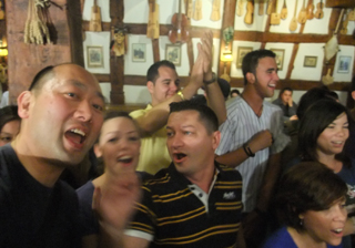 | 1階では、すでにダンスが始まってました。地元ドイツはもちろん、スペイン、クロアチアなどなどいろんな国の人たちです。ダンスは、それぞれの国のを教えてもらえます。 しかし残念ながら、日本男子は人気がない!!! ダンスは男性が女性を誘いリードするもの。日本人男子を誘ってくれる外国人女性はいますが、それは最初だけです。ダンスが下手とわかると、すぐに離れていきます。 逆に日本人女性は大人気!いろんな国の人が誘いに来て、ダンスを教えてくれます。モテモテです。 |