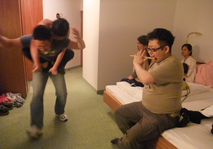 部屋に戻ると、ベッドへ直行し、即寝。 ゴーーーーー、グーーー!の大いびき。こんなほそちぃ、初めて見ました。 「明日の本番に向けて練習したいです」 そう、今回のツアーでは麻由ちゃんは、初チャレンジのポジションです。普段は地方=笛なので、踊り手の練習なんてほとんどしたことがありません。なのに、いきなり舞台の本番なんて・・・。無理言ってごめん!ありがとう! 背負われ方、降り方、タイミングなど何度も練習しました。 横で笛は吹くわ、わぁわぁ相談してるわ、その中でほそちぃは爆睡でした。 |