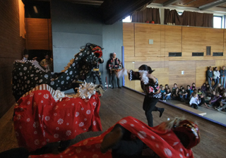 | 舞台から飛び降りて、生徒たちの間に入っていきました。まさか来るとは思ってなかったのでしょう。わいわい、ぎゃーぎゃー、盛り上がりました。 このあと、ルーマニアが同じことをやりました。 「あーー、うちらがウケたんを見て、さっき楽屋で突貫で作ったな!」 というのは冗談で、ツァープです、ヤギのことです。お賽銭を催促・回収していく役目なのかもしれません。 |