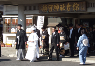 そんな澄み切った青空の下で、参進が行われました。日本人らしくて、本当にいい挙式です。これこそ一生に残る神前式です。境内に響き渡る雅楽の音色が厳かな気持ちにさせてくれます。 ☆ ☆ ☆ さて本日ぼくたちの出番は、ご両親への花束贈呈の前です。入念にリハーサルを行い、待機の間は、準備体操などして体をあたためておきます。 |