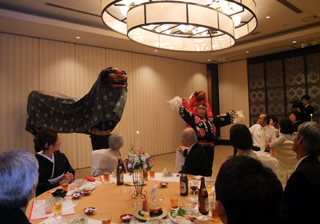 | やわらかい雰囲気に包まれて、獅子舞がスタート! 高砂を真正面にして、演舞です。 始めに1頭が、続いて誕生獅子が決まって2頭が、勇壮に舞いました。 その勢いのまま高砂へ向かい、新郎新婦さんをガブーッと噛みました。本日の主役で、人生のなかで一番ハレの日です。 ここでお二人からいただいた【幸せ】を、練り歩きでご列席の皆さんを噛みながら分かち合っていきます。 |