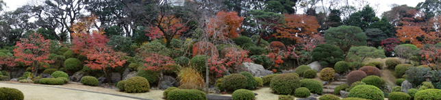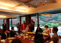ここはお庭(名勝の立体庭園)がどの席からも綺麗に見えるよう配慮されていて、奥行きが短く横長の会場となっています。 動線の確認、端から見たときの印象、全体を包む演出、それぞれの演舞の所作の指導などなどをチェックします さらにPAスタッフさんと司会者さんとも打ち合わせをし、入念にリハーサルをします。 |