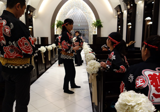 | 出番はお色直しで新郎新婦さまが再入場されてからになるので、待ち時間を利用して、近所のTULLY'Sで早めのランチ。 戻って、着替えて待機です。 控室はチャペルでした。 |