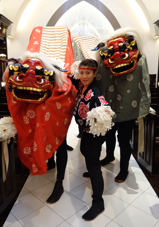 さらに、生まれる前には思わぬチラ見せというハプニングがあり、ご列席のおじさまたちは大喜び! 獅子舞を初めてご覧になる方が多く、獅子舞が登場してから大好評で、生まれてさらにびっくり、そして練り歩きで皆さまを噛んでいき、会場を多いに沸かせました! ぼくたちも踊ってて、とても楽しかったです。 |