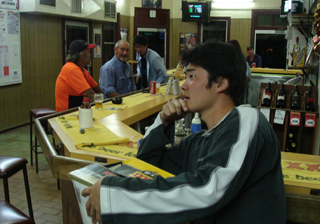 今夜もやっちゃいました、キョウヘイ。 「今日は、もう外さない」と意気込んで、さんざん悩んで選んだのに、「え?これだけ・・・?」と絶句のキョウヘイでした。 キョウヘイの食事運の無さは、モスマンから始まったらしいです。ラーメン屋で、ラーメンを頼まず丼を頼んだら、それがかなりしょぼかった、と。 (キョウヘイが選んだメニューは避けるべし)と密かに、みんなの胸の内に広がっていきました。合言葉にさえ、なりつつありました。 |